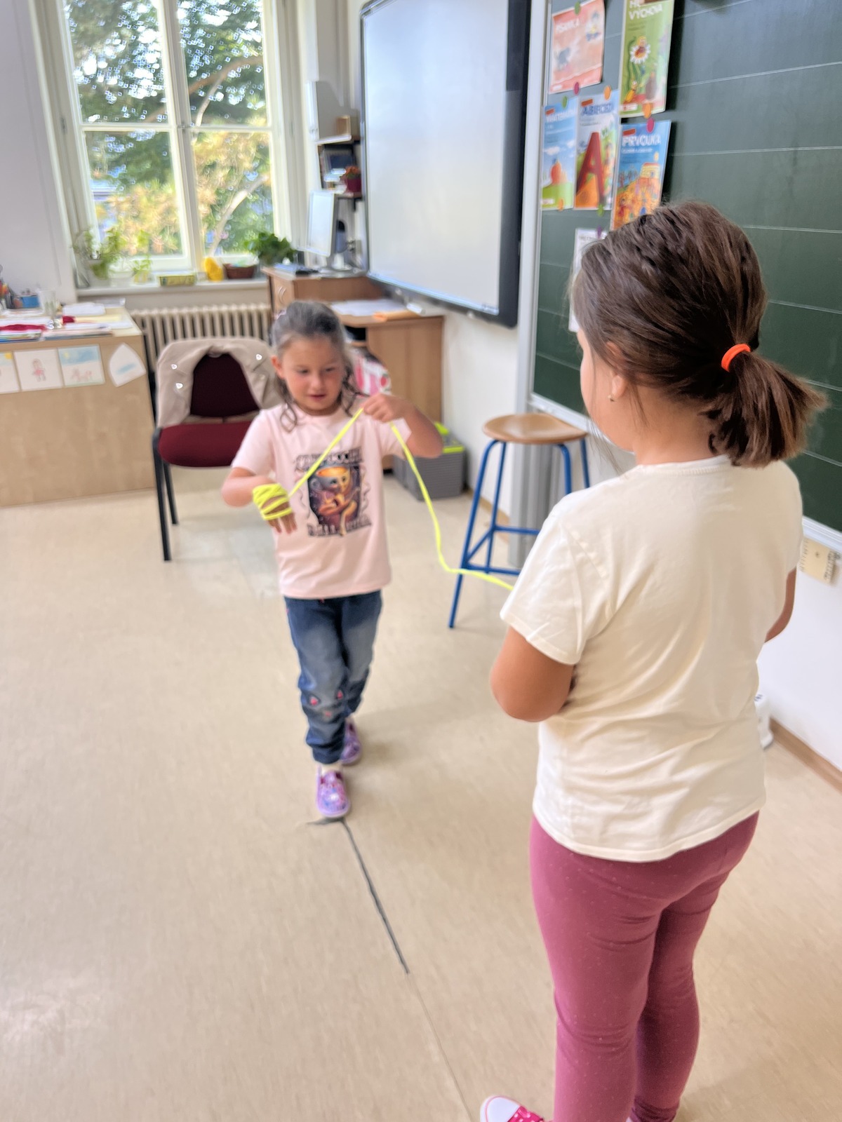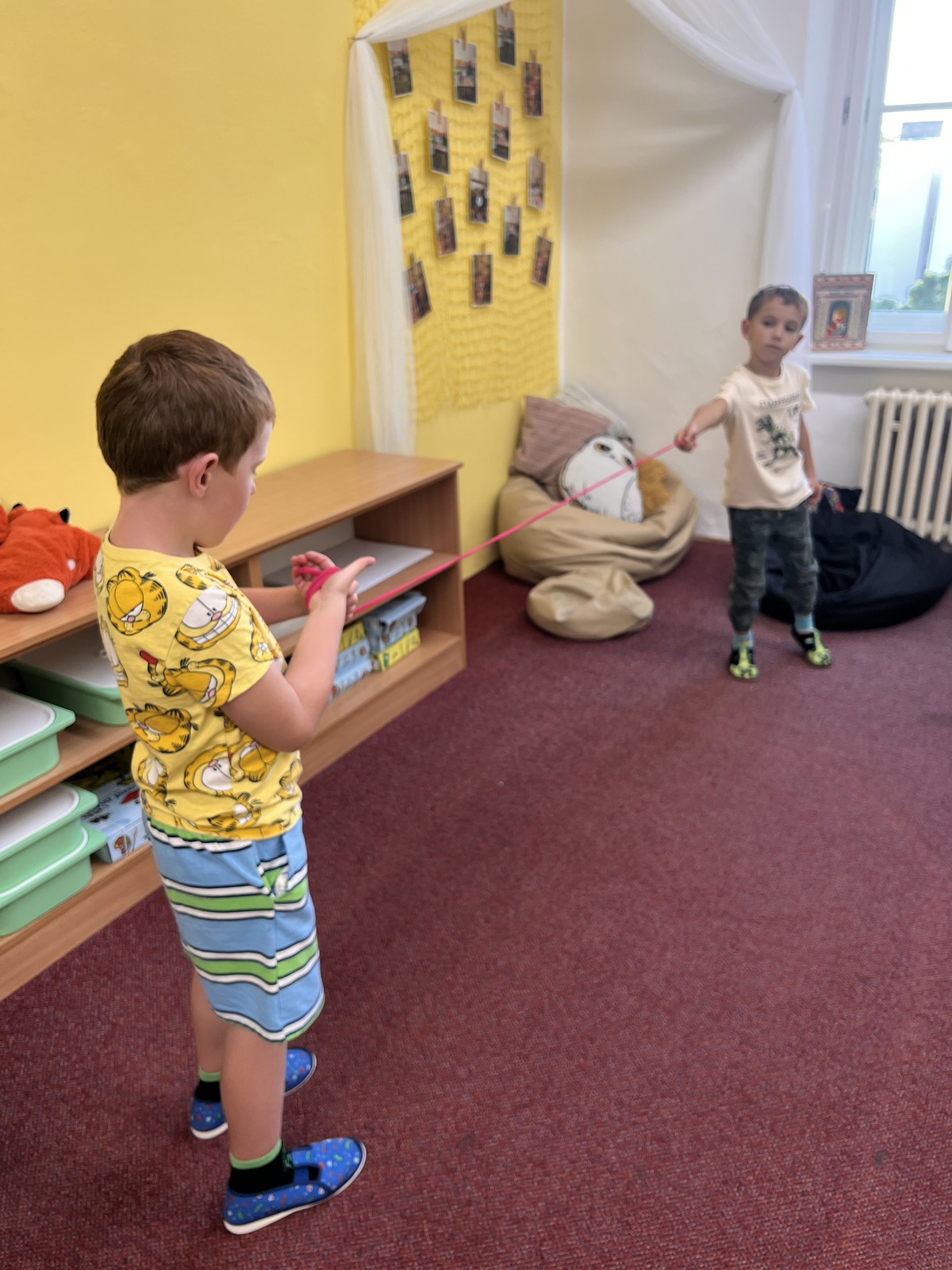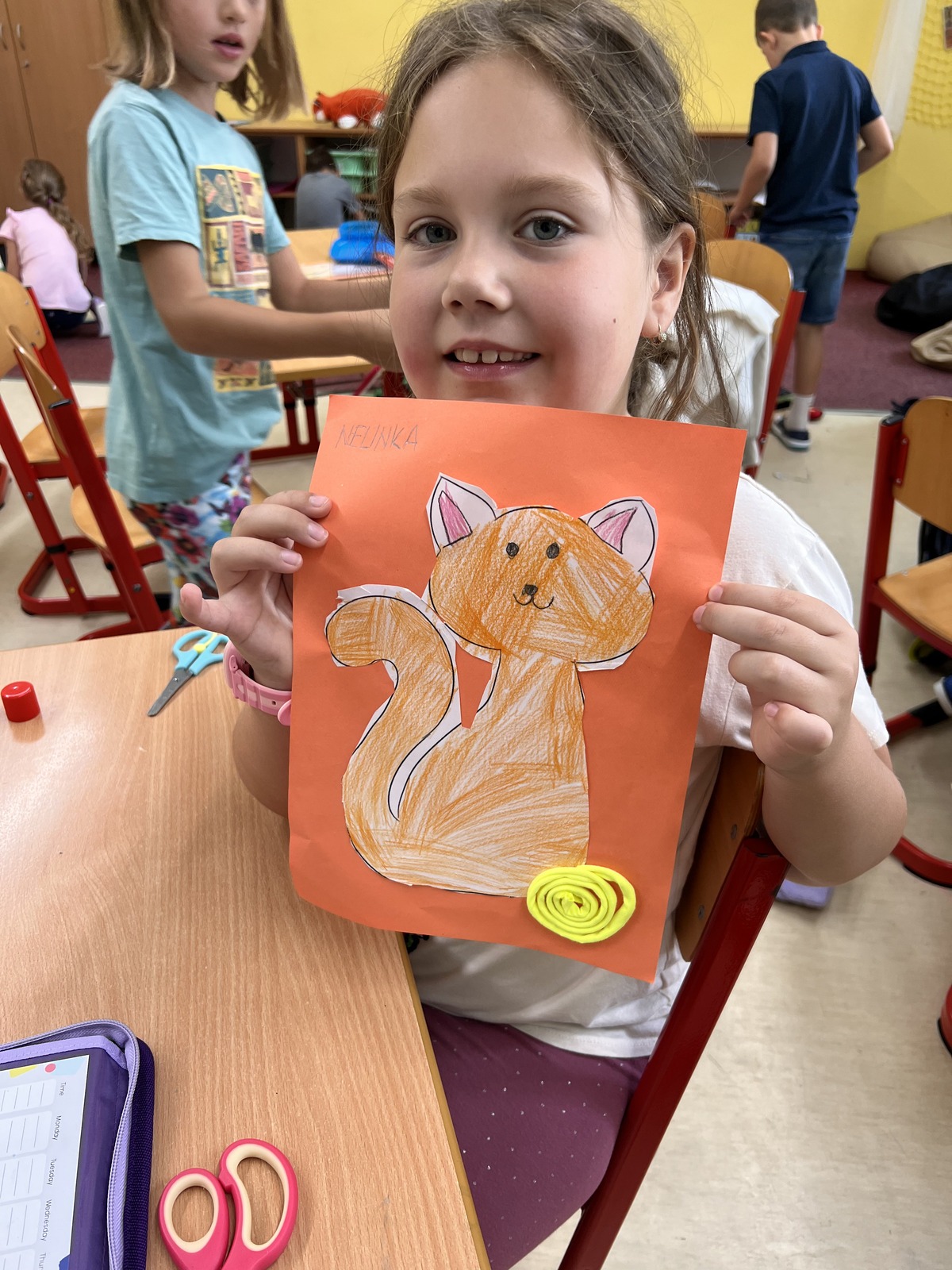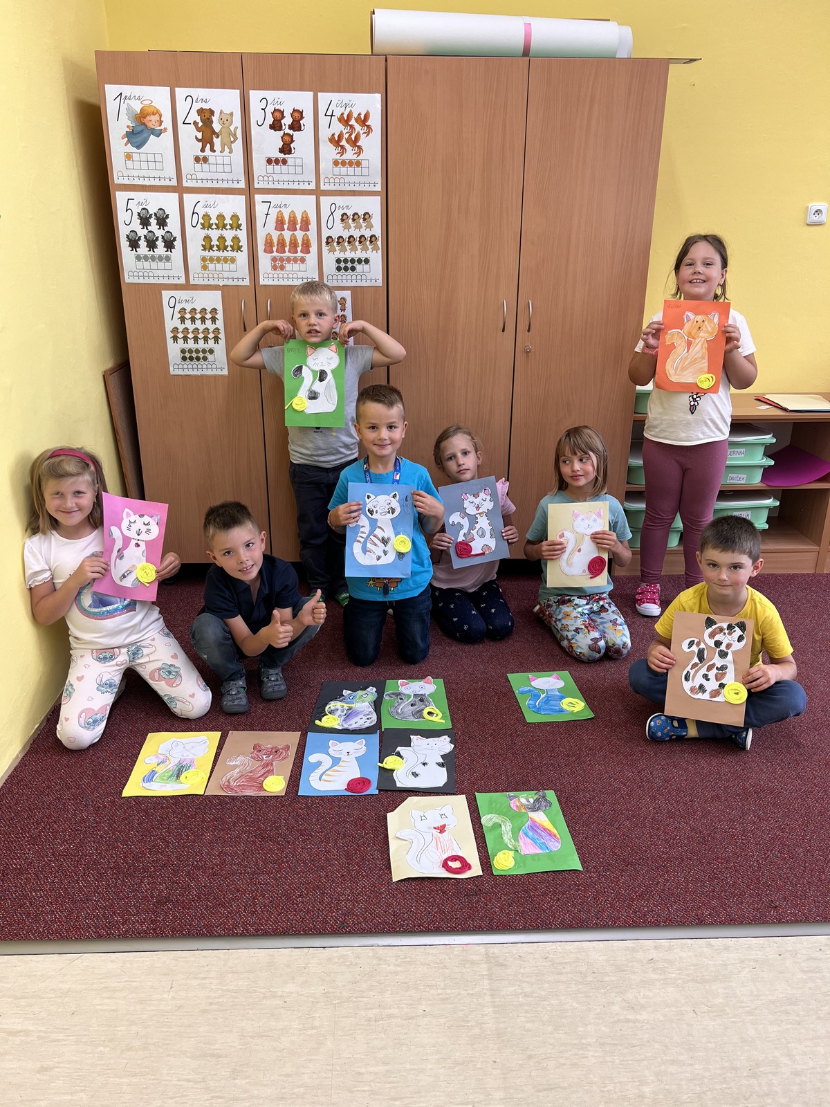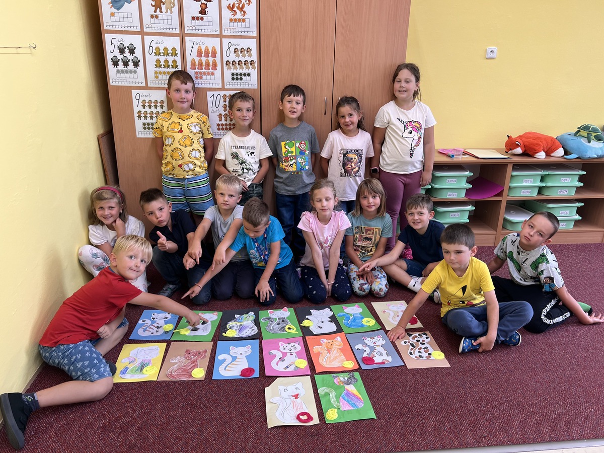 Během týdne si děti vyzkoušely také aktivity rozvíjející jemnou motoriku – například namotávání klubíčka. To se stalo inspirací pro výtvarnou výchovu, kde vznikly veselé papírové kočičky s vlastním klubíčkem z bavlnky.