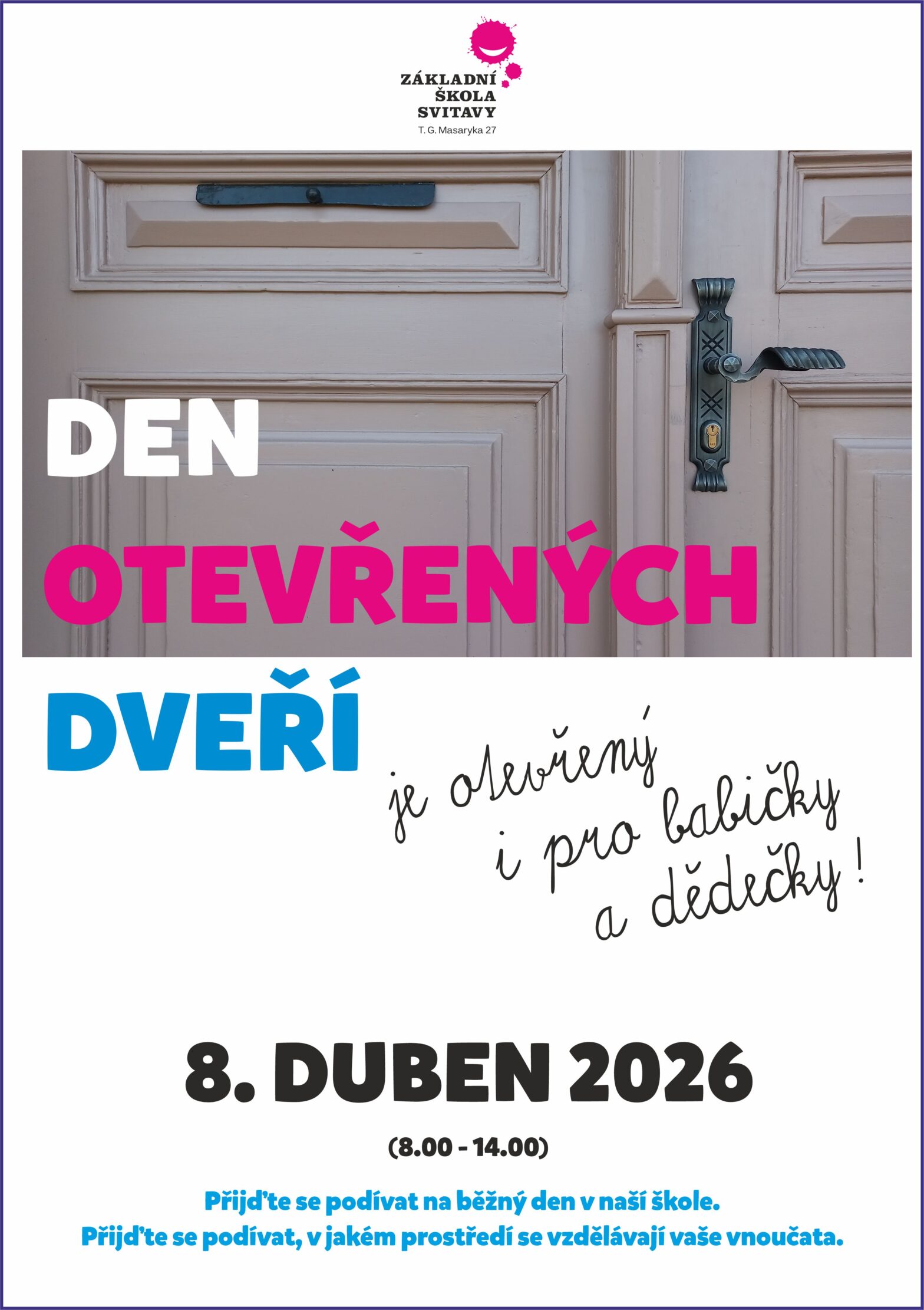 Pozvání není adresováno pouze rodičům, ale i babičkám, dědečkům a jiným přátelům školy, kterým se jejich děti a vnoučata chtějí pochlubit, jak to u nich ve škole vypadá. Den otevřených dveří se uskuteční 8. dubna a bude probíhat celý den od 8.00 do 14.00.