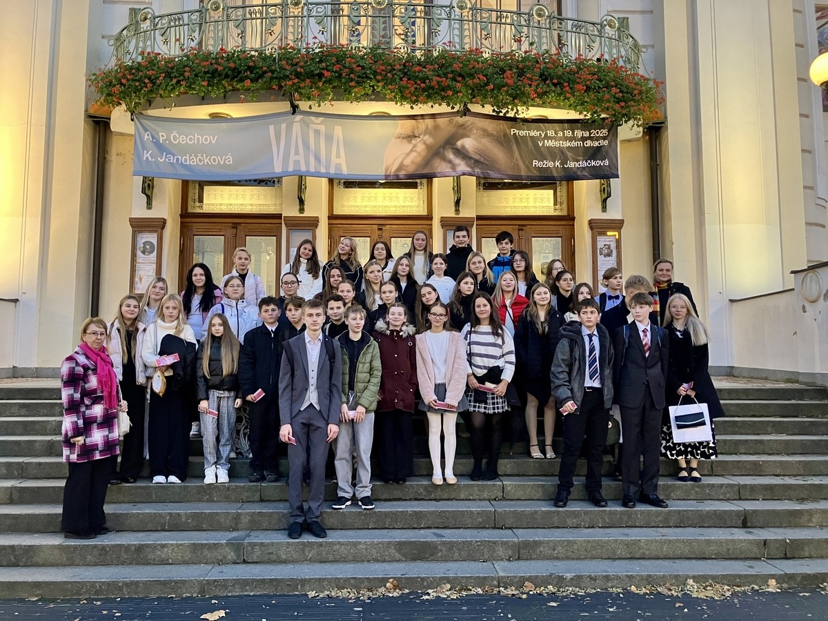 Žáci 2. stupně 6. listopadu 2025 poprvé v tomto školním roce navštívili Východočeské divadlo v Pardubicích a zhlédli dojemnou divadelní hru Vzpomínky na T (myšlen Terezín), kterou nastudovala starší sekce Mladého divadelního spolku LAIK pod režijním vedením Zdeňka Rumpíka. Představení zanechalo v divácích hluboký dojem – herecké výkony mladých umělců byly mimořádně přesvědčivé, hudební doprovod umocnil silnou atmosféru a příběhy těch, kteří přežili hrůzy terezínského ghetta, se dotkly srdcí všech přítomných. Naši žáci si zaslouží velkou pochvalu – po celou dobu se chovali velmi kultivovaně, s úctou k umělcům i tématu hry. Bylo potěšením sledovat, s jakým zaujetím a respektem vnímali divadelní zážitek, který v nich jistě zanechá trvalou stopu.