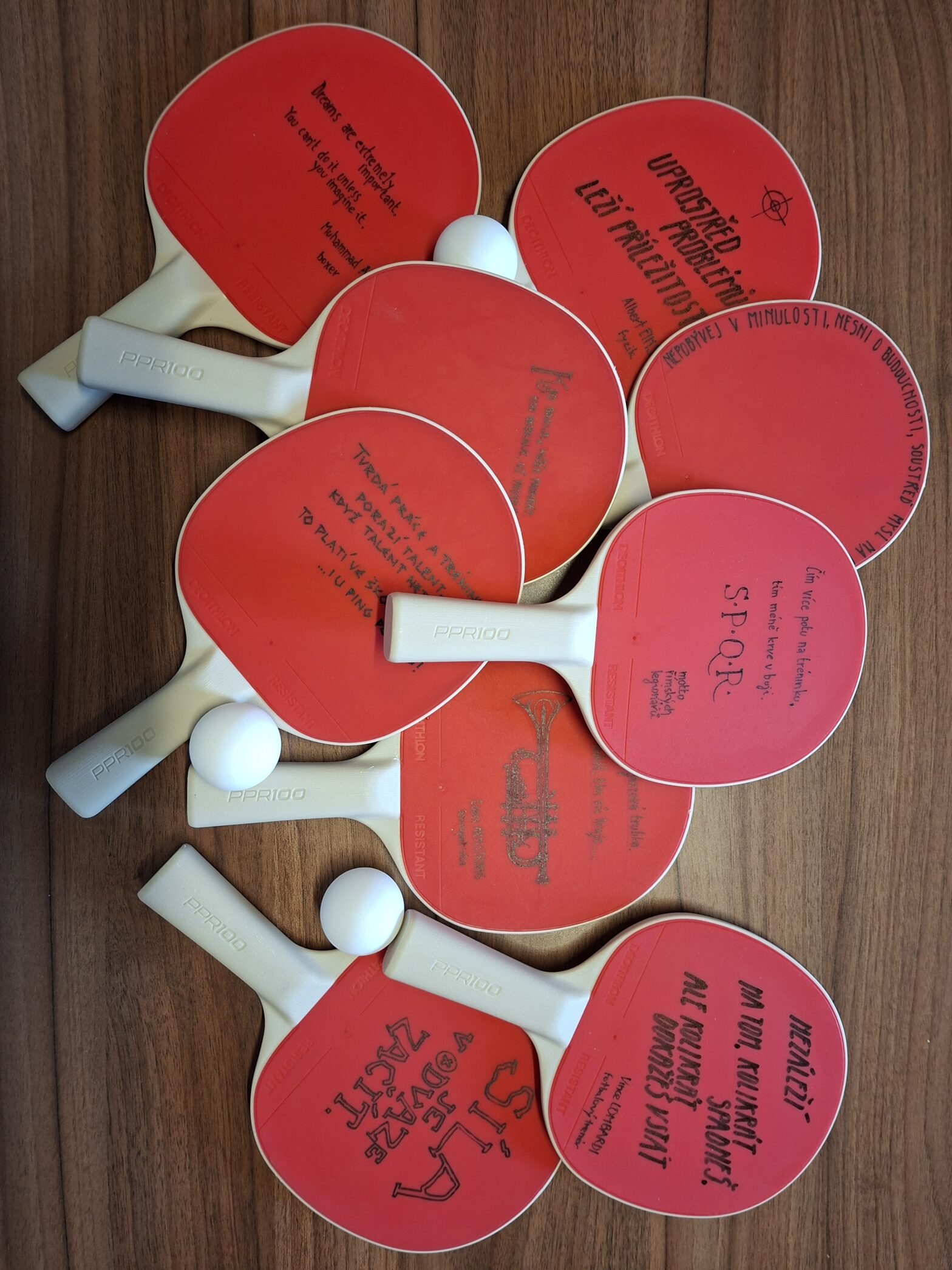 A máme tu výsledky kreativní výzvy na hledání motivačních citátů na nové ping pongoové pálky. Děkuji všem, kteří se aktivně zúčastnili. Z necelé stovky došlých odpovědí bylo vybráno devět myšlenek, které doplnili tu „vzorovou“ od Louise Armstronga. Některé můžete vidět na přiložených obrázcích. Aby pro vás čtení bylo zajímavější, tak vám tři z citátů prozradím a vy si můžete tipnout autora. Všichni nabídnutí autoři jsou zároveň autory citátů z našich a my jim děkujeme za inspiraci.