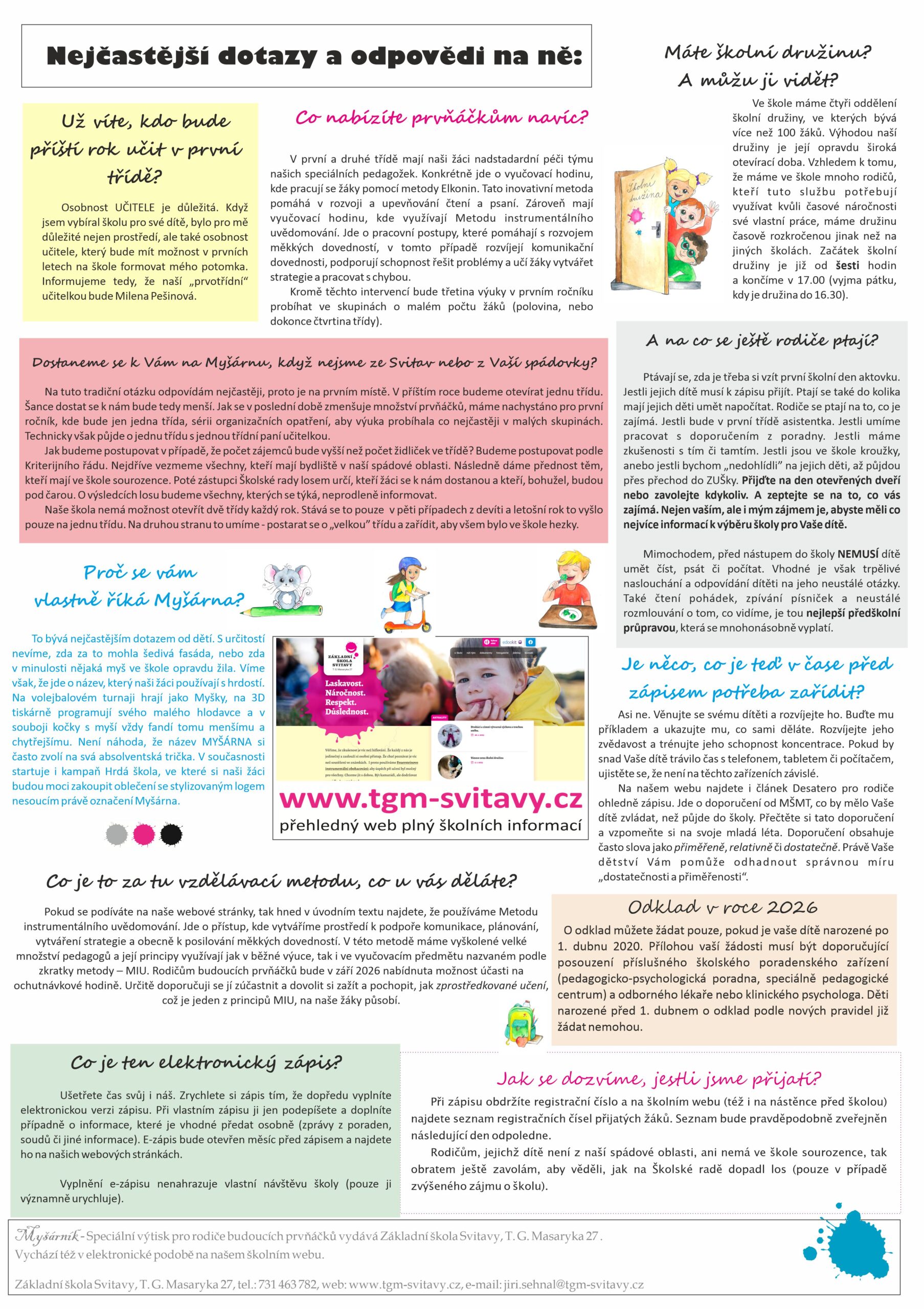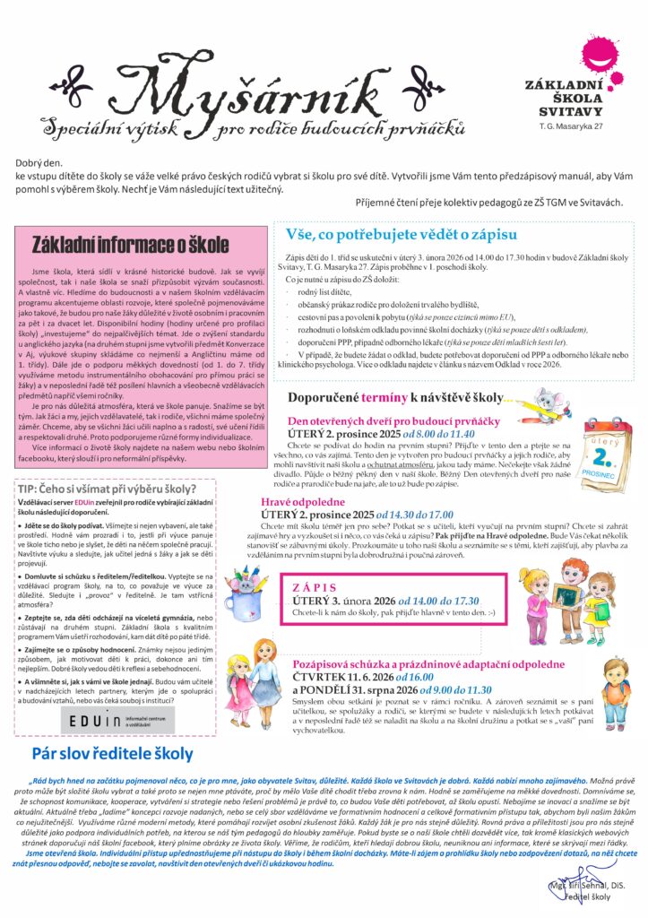 Vše důležité, co potřebujete vědět ohledně zápisu, naleznete zde, v Manuálu pro rodiče budoucích prvňáčků. Nejdůležitější informace je, že den otevřených dveří bude 2. prosince.