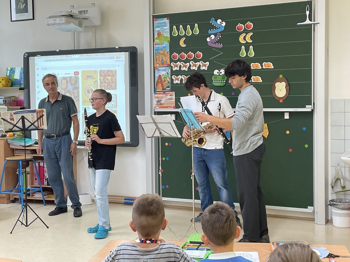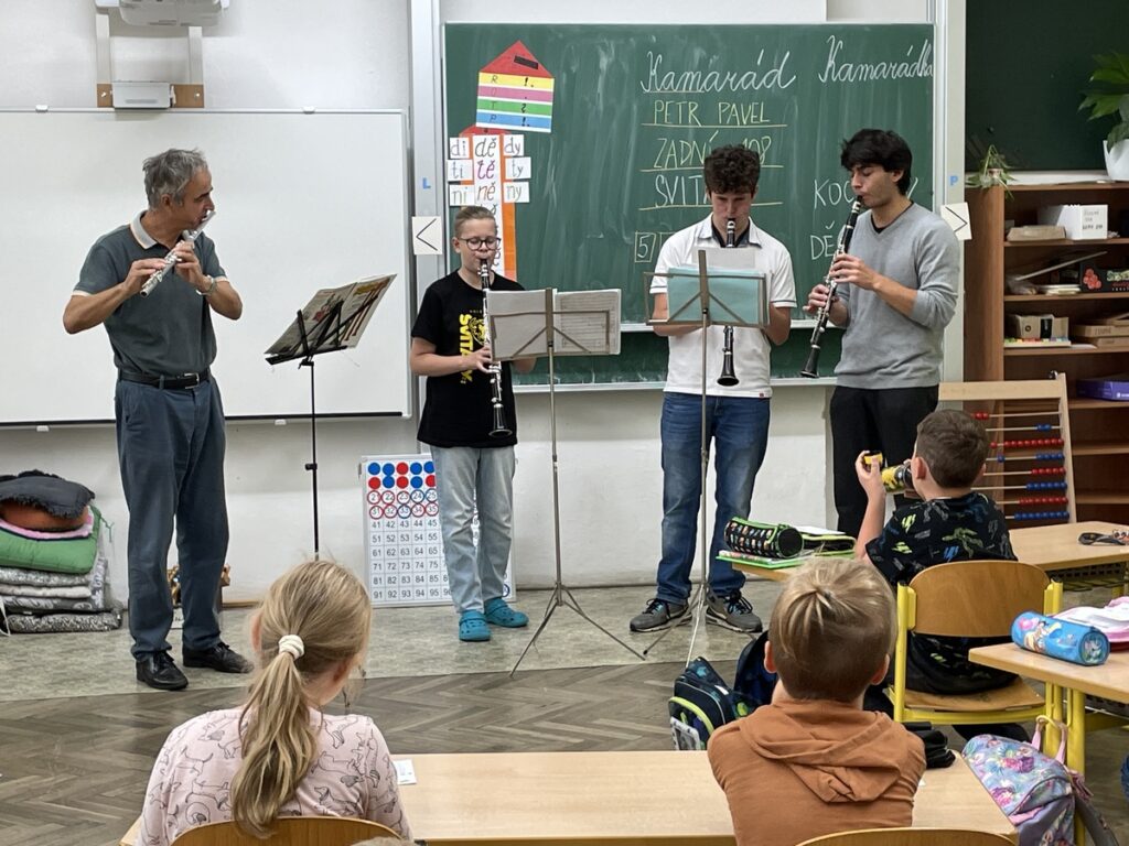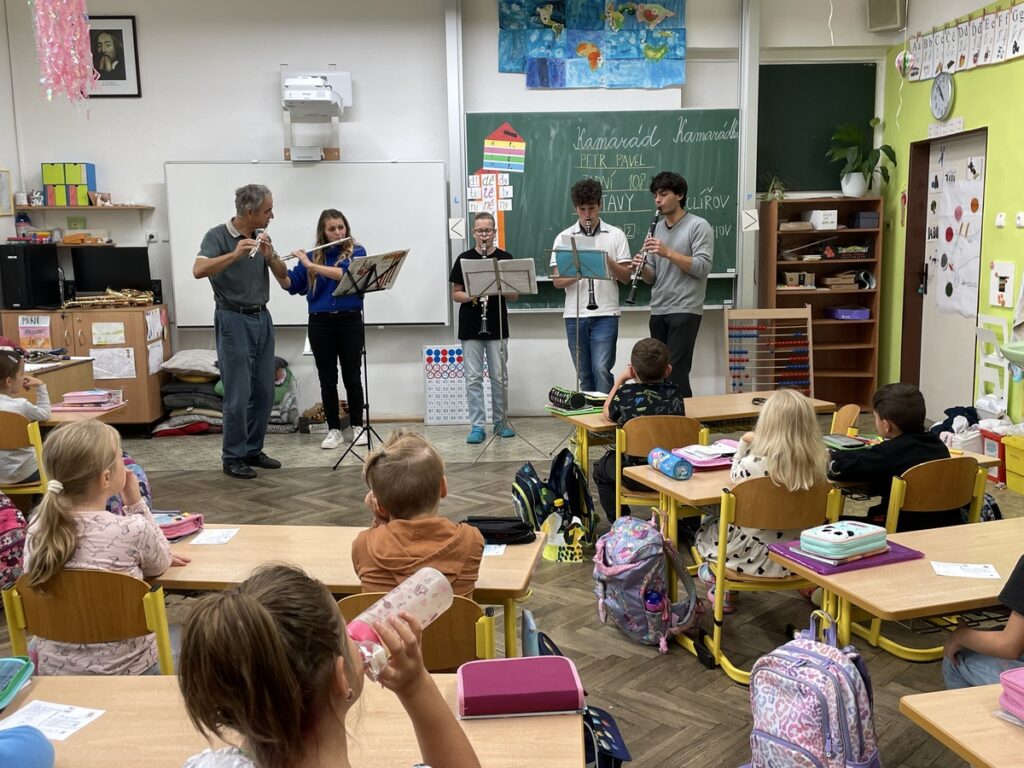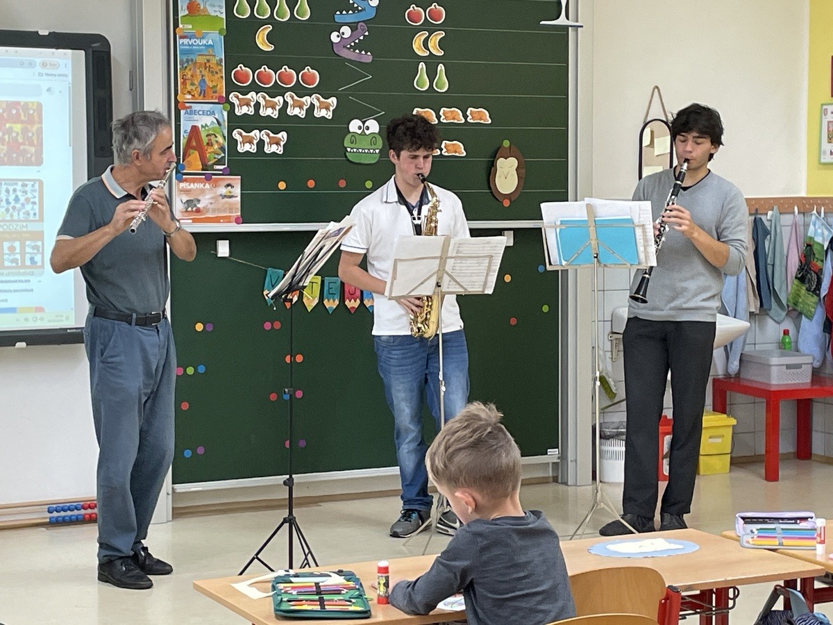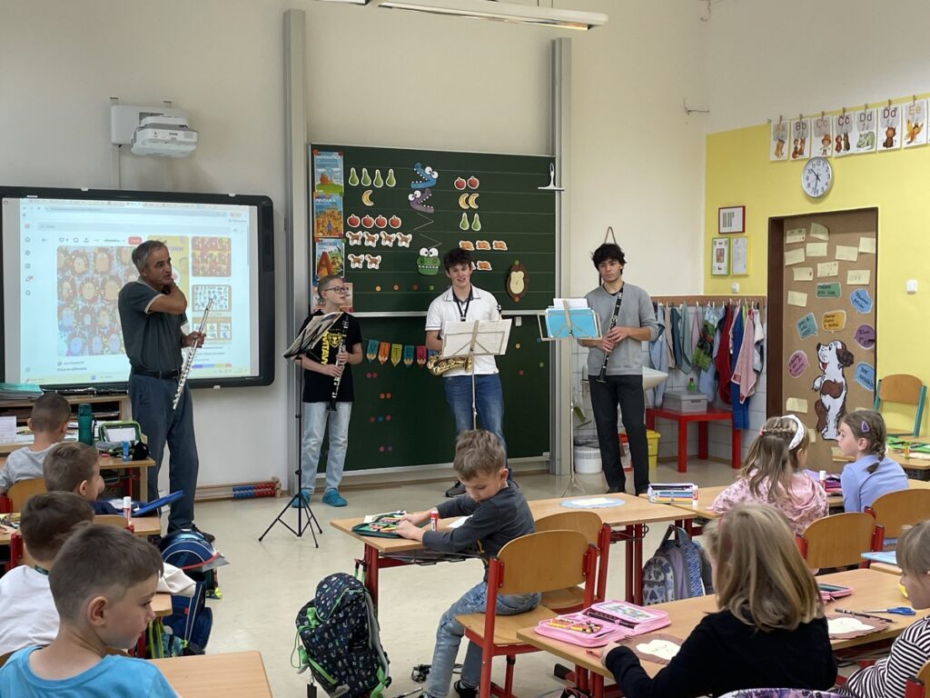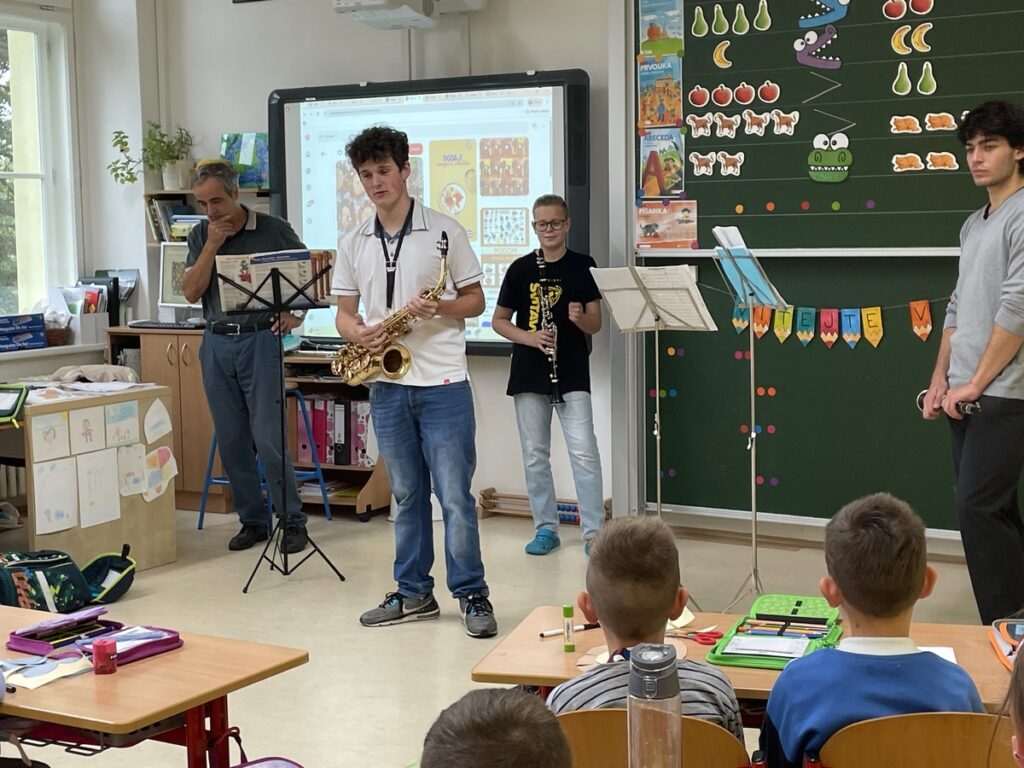 Dne 26. 09. 2025 navštívil pan učitel ze ZUŠ, Bc. Petr Jeníček se svými žáky naši základní školu. Navštívili společně první a druhé třídy, kde dětem zahráli ukázky jejich nádherné hudby.