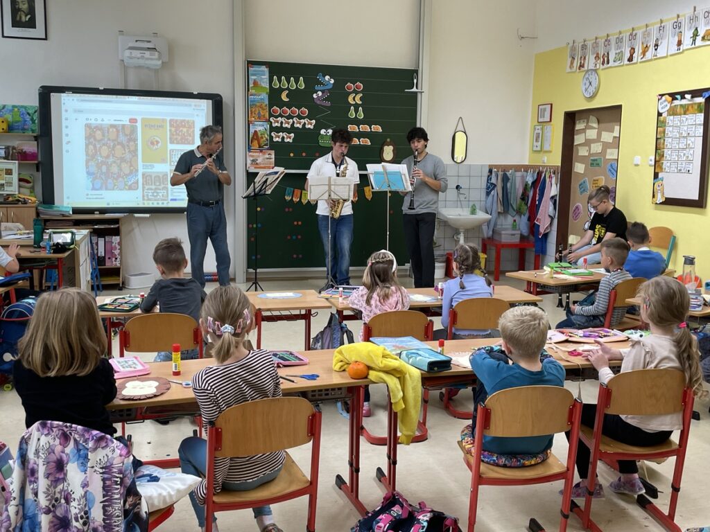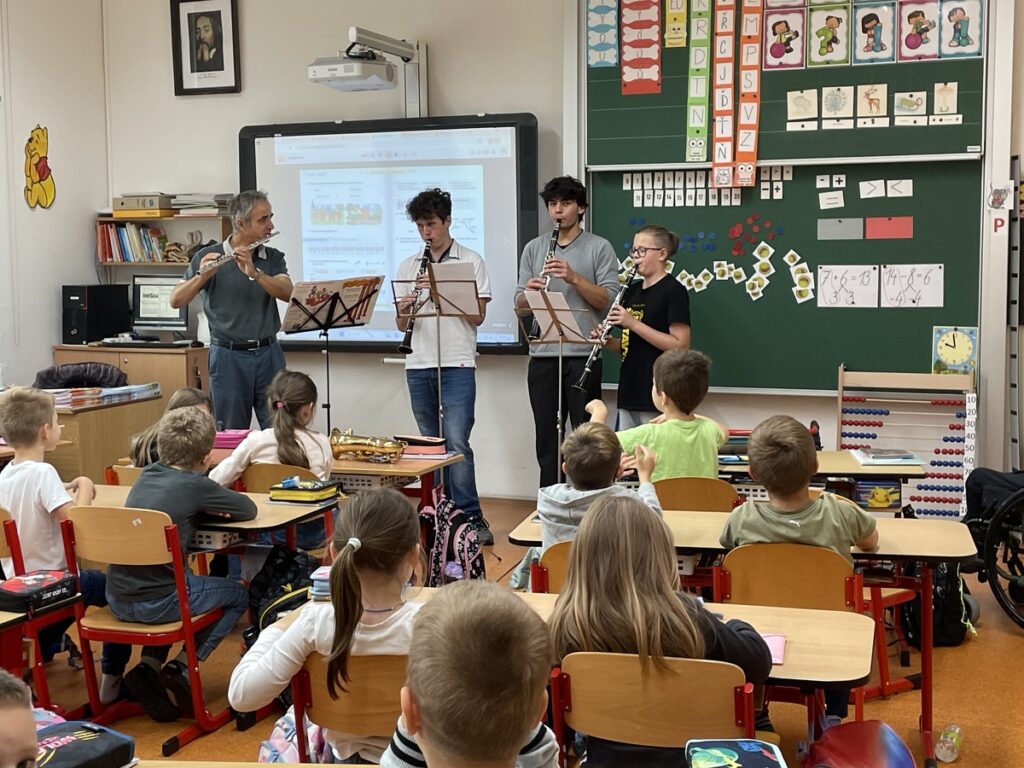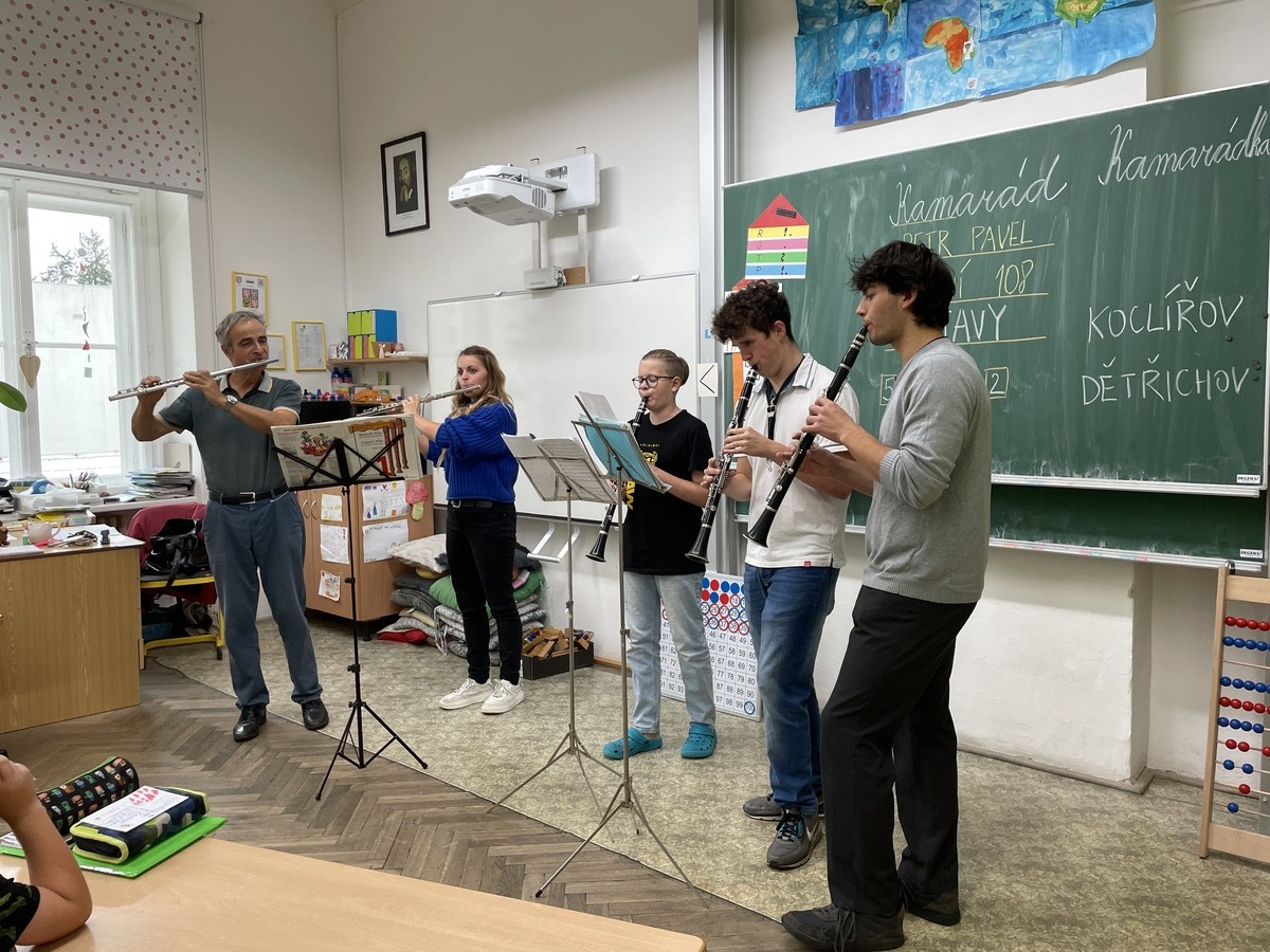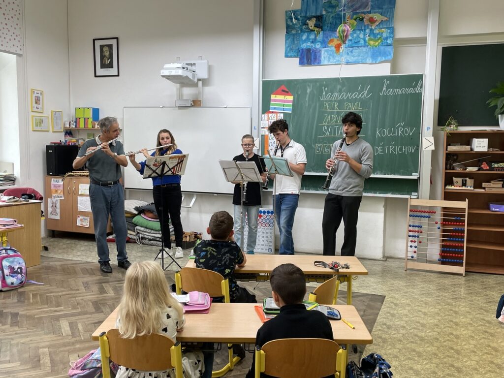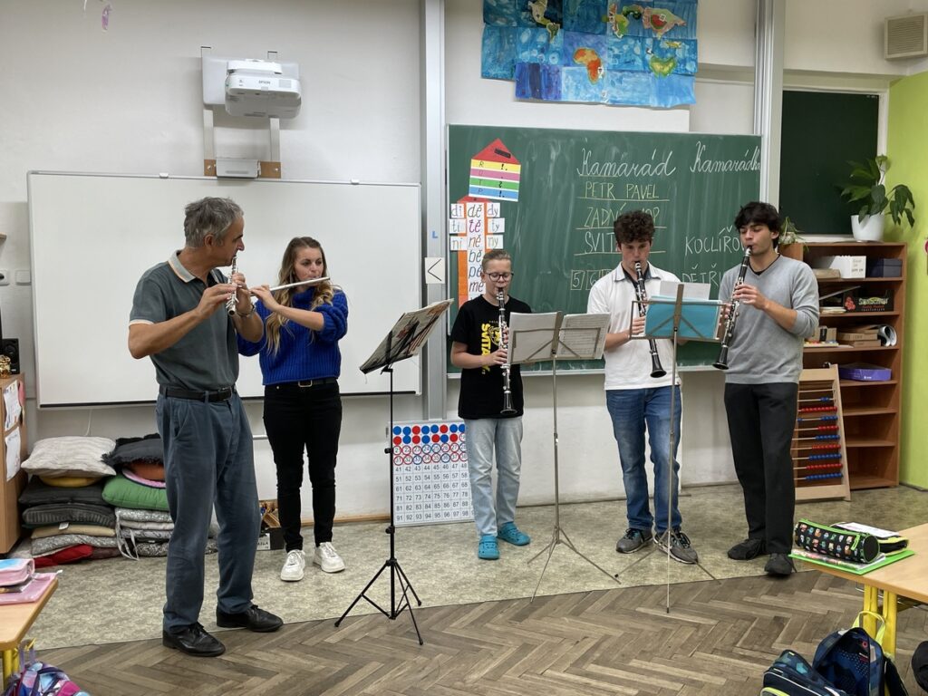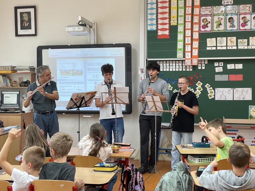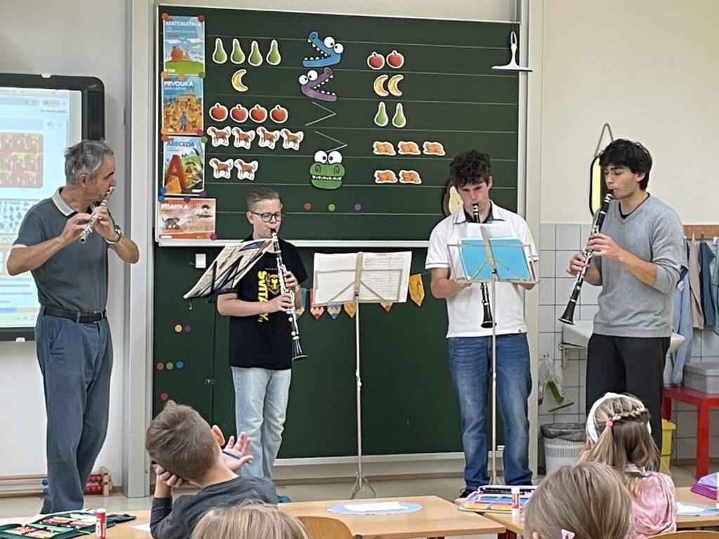 Dne 26. 09. 2025 navštívil pan učitel ze ZUŠ, Bc. Petr Jeníček se svými žáky naši základní školu. Navštívili společně první a druhé třídy, kde dětem zahráli ukázky jejich nádherné hudby.